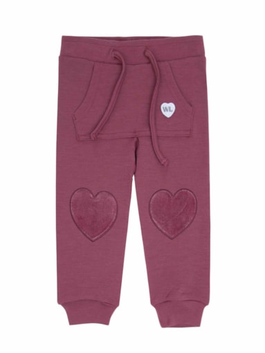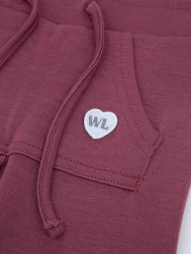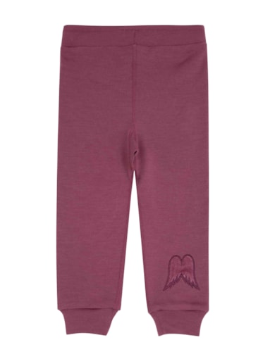 Ullbukse til baby i premium 100% merinoull. Kenguru lomme i front, snøring i elastisk liv og strikk neders på mansjettene. Dekorert med englevinge nederst på bakside leg for å matche overdel med vinge på rygg. Hjerteformede patcher over knær for ekstra beskyttelse.