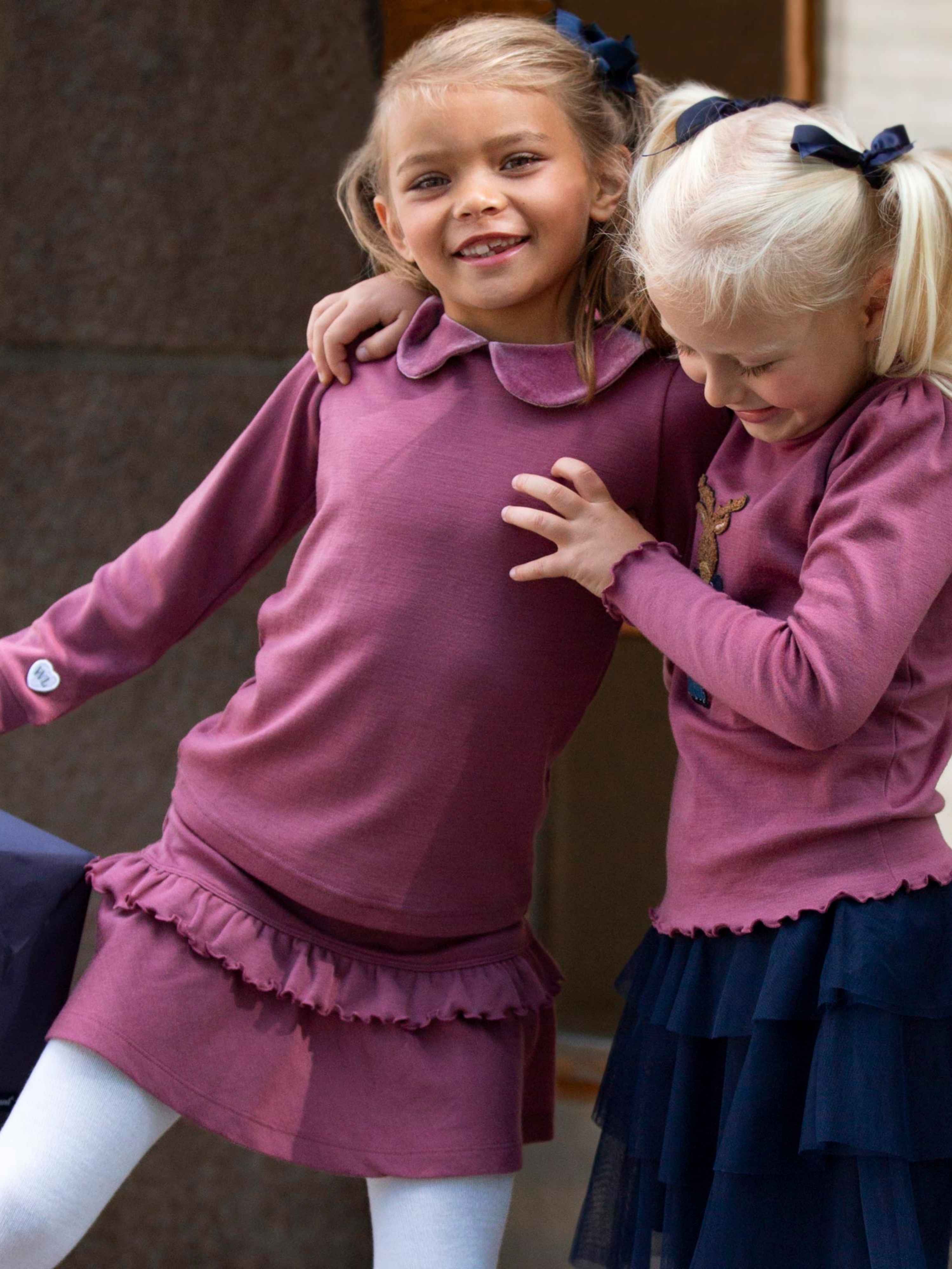Pyntet ullgenser i premium 100% merinoull. Detaljert med krage rundt halsen i fløyel og puffermer, med perleknepping i nakken.