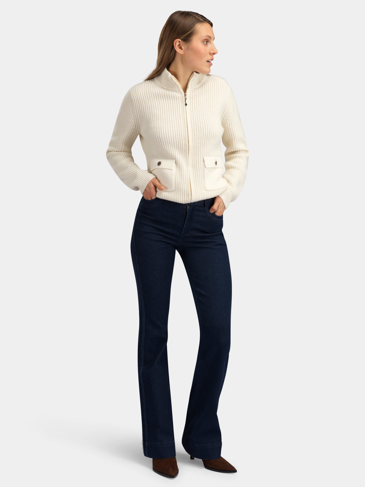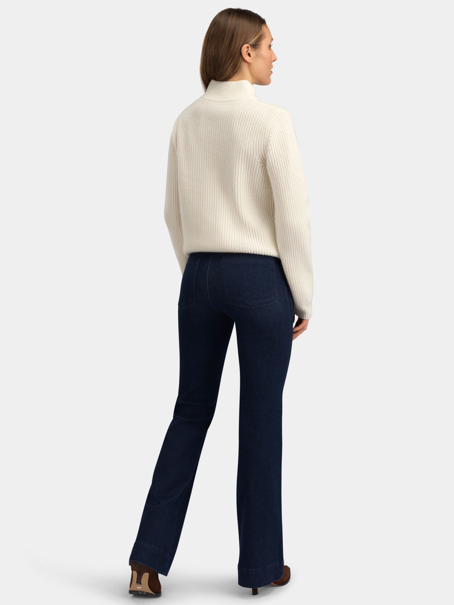 Fløya Ulljeans i 9% ull. Den har en feminin passform med lett utsving nederst. Jeansen har et tidløst uttrykk med rene linjer, markerte sømmer og en signaturdetalj på baklommen.