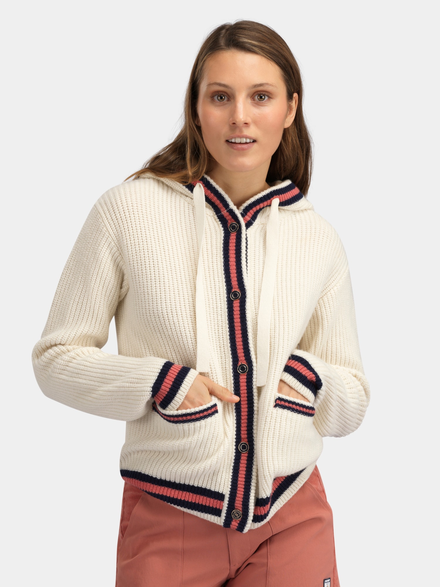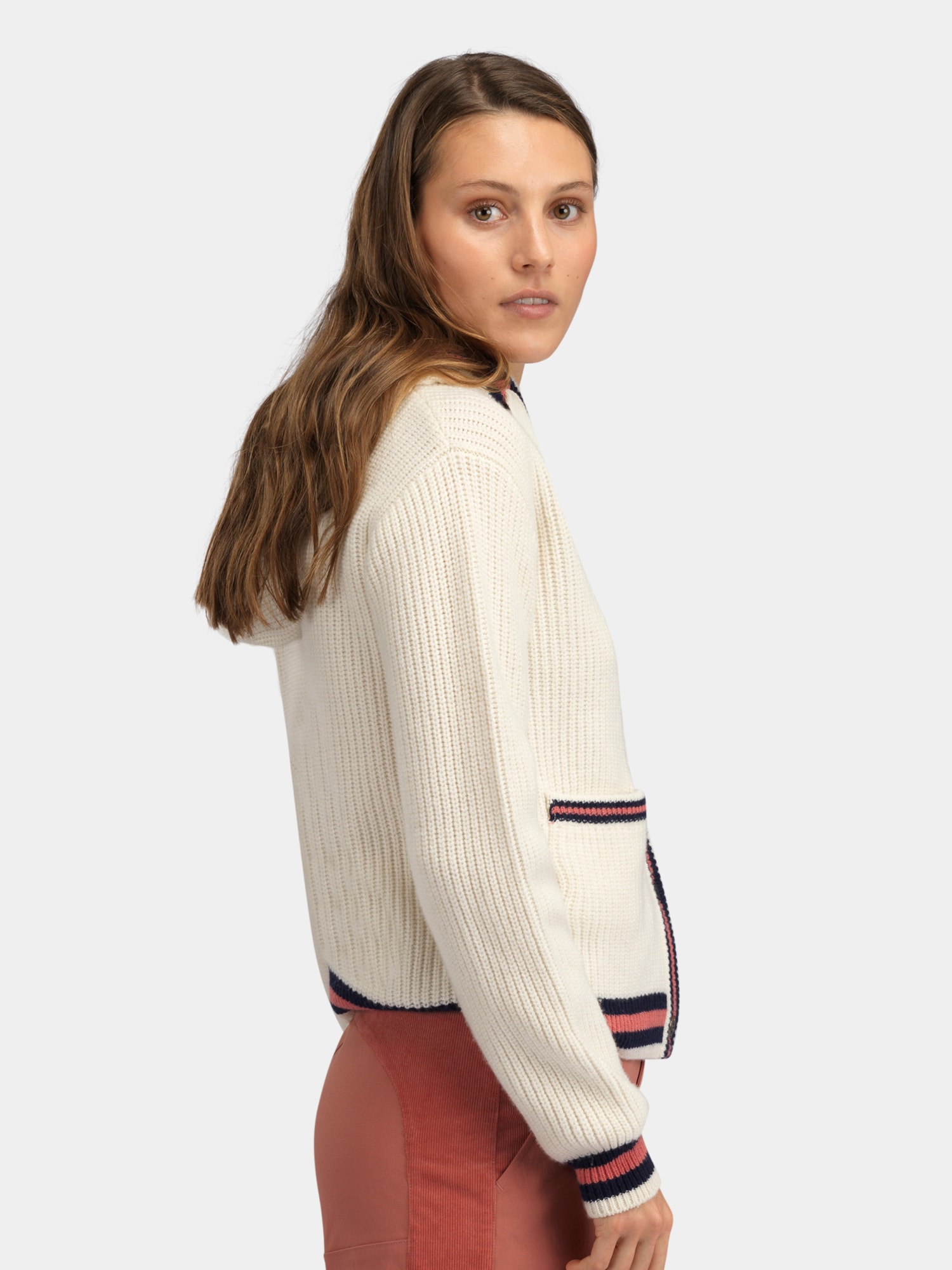 Glittertind strikkejakke til dame er designet i en sporty stil med knappelukking, stripede ribbdetaljer og smale striper. Laget i en myk merinoblanding som gir god komfort og et stilrent uttrykk i hverdagen.