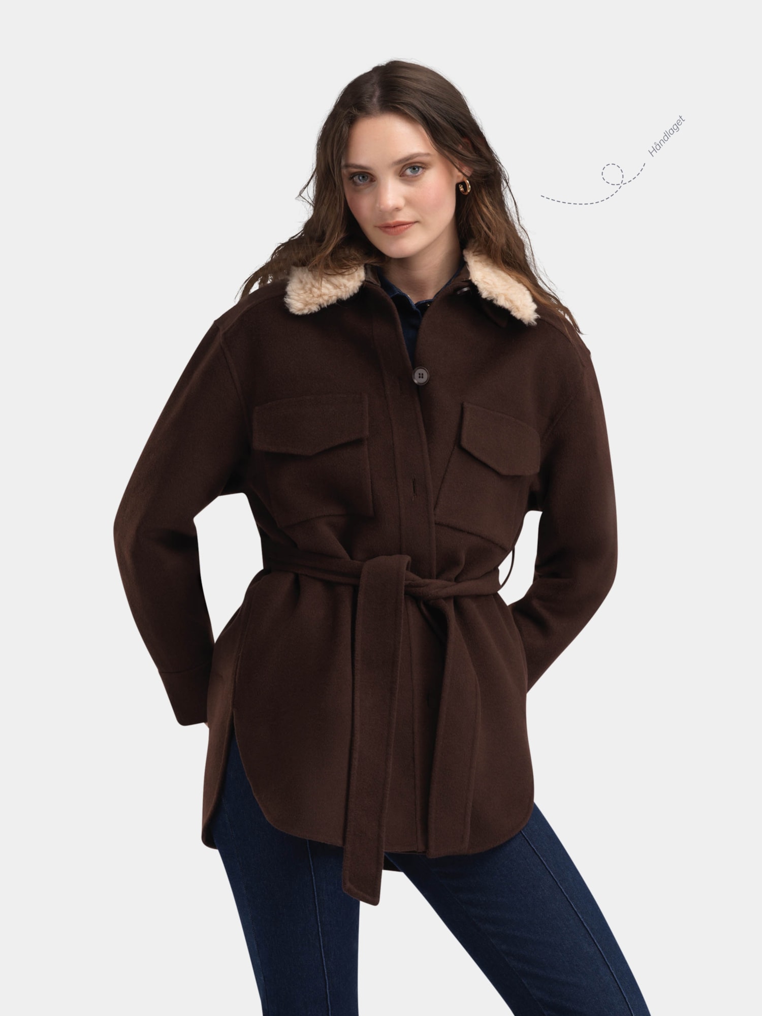 Skålatårnet jakke er en elegant ytterjakke til dame designet som en skjorte. Den er laget av en luksuriøs blanding av 90% ull og 10% kashmir for optimal varme og komfort. Jakken er utstyrt med et belte i livet, bryst- og sidelommer for både funksjonalitet og design. Den har også en avtagbar pelskrage i 100% lammeull, som gir ekstra varme og et stilig preg.